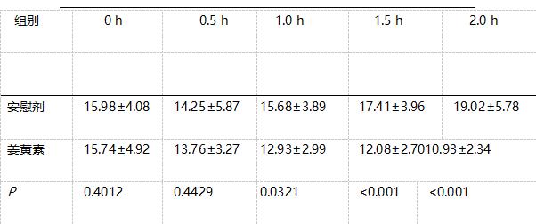 Rasyid 等[ 1 1 ]為比較姜黃素和安慰劑對健康例體膽囊的作用。將12 例受試者分為兩組進行隨機雙盲交叉研究,在給予姜黃素或安慰劑前空腹膽囊容積分別為( 15.74±4.29)mL和(15.98±4.08)mL,二者相似;分別給予20 mg姜黃素或相同量安慰劑后0.5,1.0, 1.5 和2 . 0 h 測量膽囊容積,姜黃素組膽囊容積分別降低了( 11.8±6.9)%,(16.8±7.4)%,(22.0±8.5)%,( 2 9 . 3 ±8 . 3 )% ,安慰劑組在0 . 5 h 后顯著下降,約( 10.9±22.8)%,1.0 h后膽囊容積開始增加,相關試驗數(shù)據(jù)見表1,試驗表明,姜黃素能夠誘使例體膽囊發(fā)生收縮。