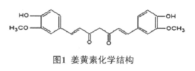 藥姜黃具有破血行氣、通經(jīng)止痛之功效,有效成分為姜黃素(curcumin)、脫甲氧基姜黃素及雙脫甲氧基姜黃素,姜黃素是其中主要有效成分[1]。姜黃素曾作為香料和食物色素廣泛用于食品工業(yè)[2],其結(jié)構式見圖1。近年,姜黃素的藥理活性不斷發(fā)現(xiàn),如抗炎、清除自由基及抗癌等[3],其中一些藥理作用已進入臨床驗證階段。現(xiàn)將近年國內(nèi)外有關姜黃素的臨床研究成果作一綜述,以期為姜黃素的應用與開發(fā)研究提供參考。
