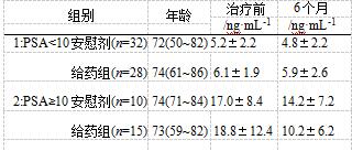 隨機將85例受試者分成兩組進行雙盲試驗,根據(jù)受試者血中PSA水平,以10 ng/mL為界分成2組。1組(PSA≤10 ng/ mL):安慰劑32例,給藥28例;2組(PSA>10 ng/mL):安慰劑10例,給藥15例,試驗6個月。2組給藥的15例其PSA顯著下降,由治療前的(18.8±12.4) ng/mL降至治療后的(10.2±6.2) ng/mL,見表2。表明姜黃素和大豆異黃酮能通過抗雄激素作用,抑制前列腺細胞中PSA產(chǎn)生,調(diào)節(jié)血中PSA水平。